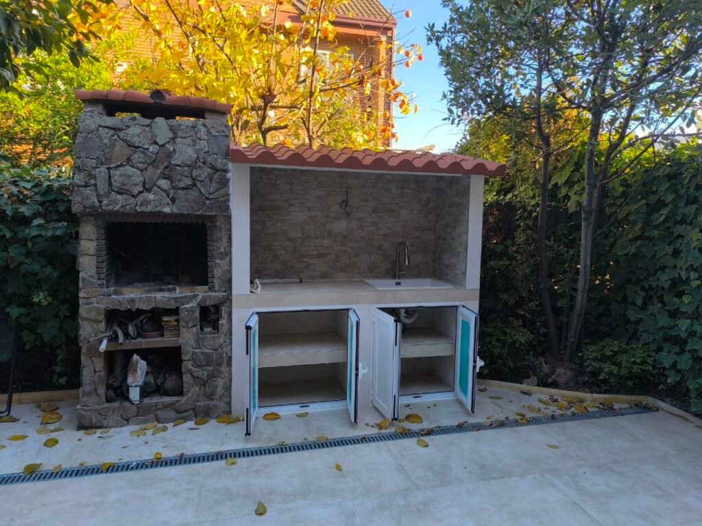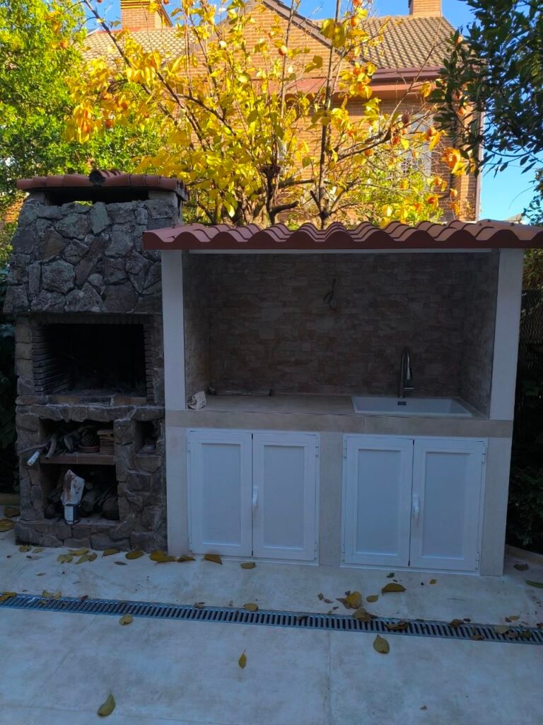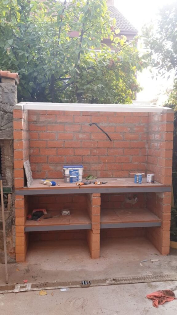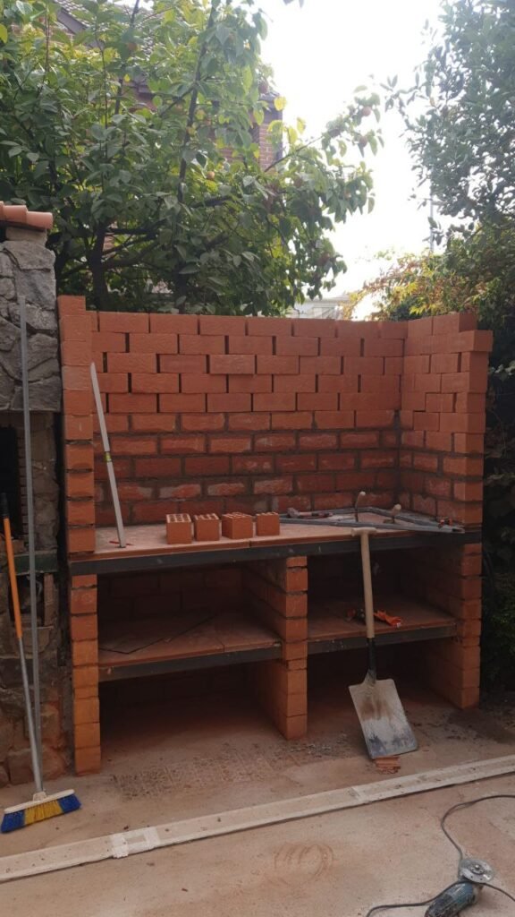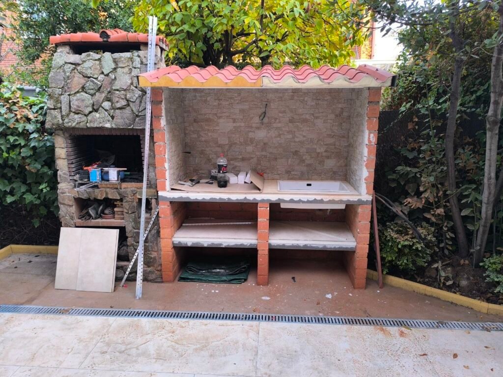 Empezamos para construir una encimera con lavabo y tejado de ladrillos y colocar un tejado de panel sandwich.
