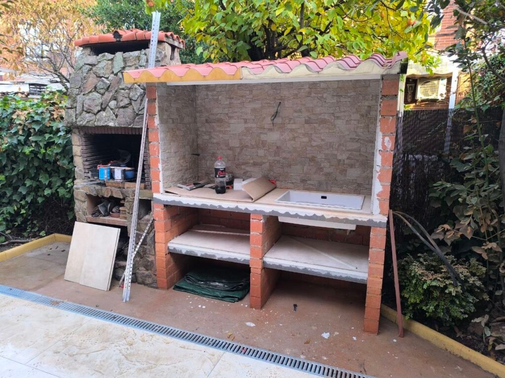 Continuamos con colocación de bordillos, colocación de suelo porcelanico,alicatar encimera y enfoscar con mortero hidrófugo partes laterales.